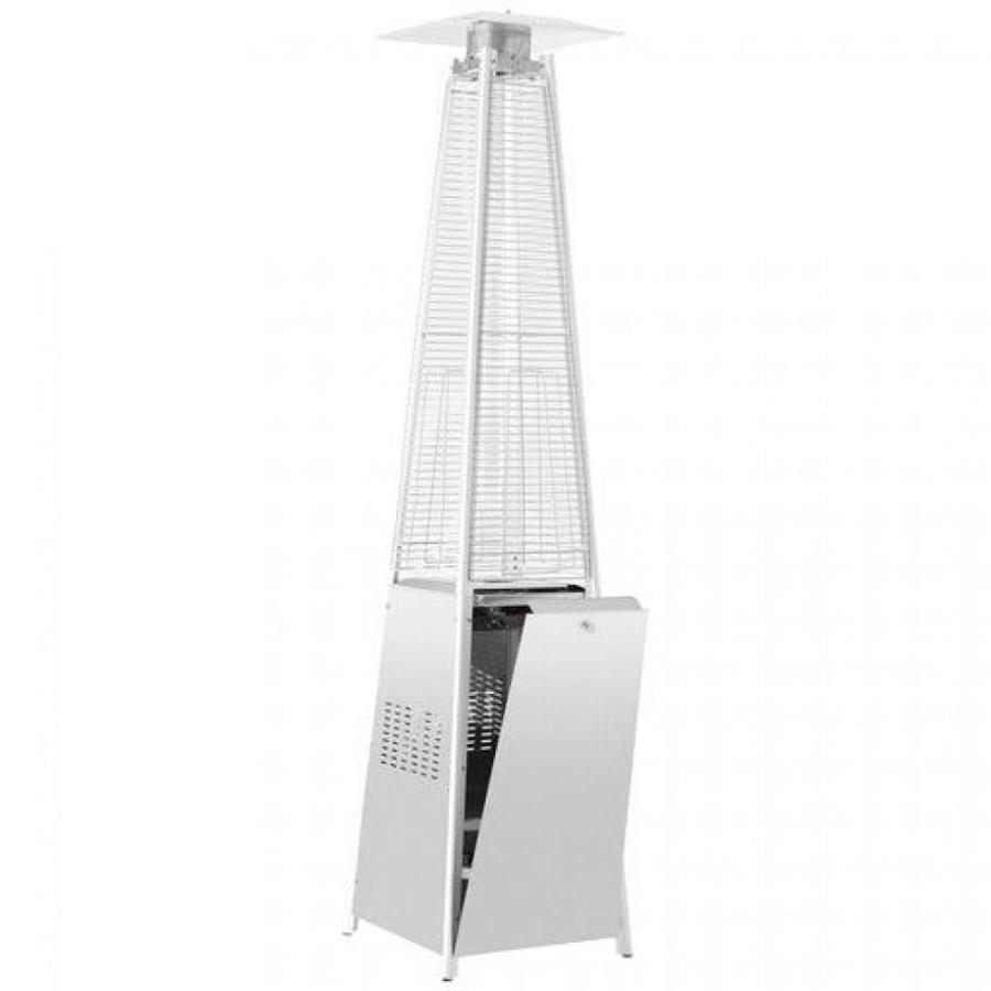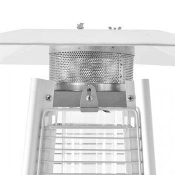 Considering the actual heating area, this high glass tube pyramid style patio heater has a scientificon it’s top — a reflector shield. Thisis necessary to reduce heat loss and allow the heat to cover up to 115 square feet. It provides heat up to 10 feet in diameter. Underneath it is a column of white iron wire and quartz glass, this ensures security.