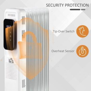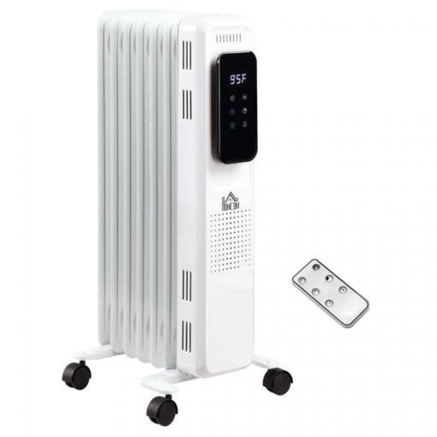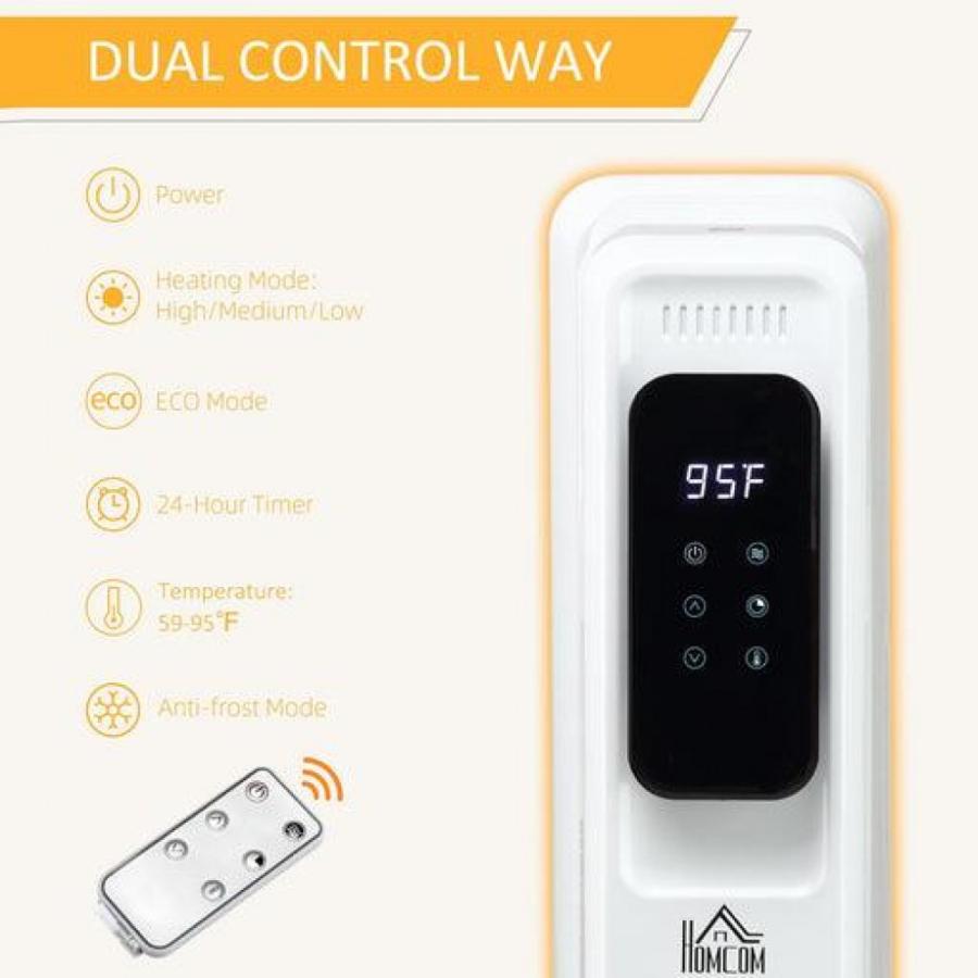 – MULTIPLE HEAT SETTINGS: Three heat settings (600W/900W/1500W) and ECO mode, and adjustable temperature settings (59-95°F) to achieve customized warmth on this radiatorwithout worrying about huenergy bills. The LED display and smart touch switch makes operation easy.- QUIET OPERATION & TIMER: The oil radiator brings you constant warmth without the noise of a fan that can disturb you from sleep, work or conversation. A 24H timer and remote control is included so you can chanthe settings from the comfort of your own bed or couch.- EASY PORTABILITY: The spacecomes with 4 rolling caster wheels so you can just grab the carrying handle and bring it to whatever room you need it in.-TO USE: Overheat protection includes a -over switch to ensure the oil filled radiator instantly switches off topotential danger. There is also an -freeze setting to helpthe unit from seizing in cold conditions.- RADIATORINFORMATION: Overall Dimensions: 13.5" L x 9.5" W x 24.75" H, Power: 600W/900W/1500W. Suitable for area of 97-161ft2.