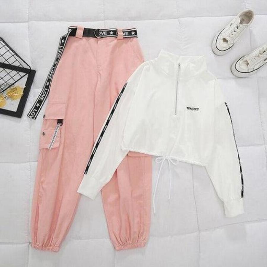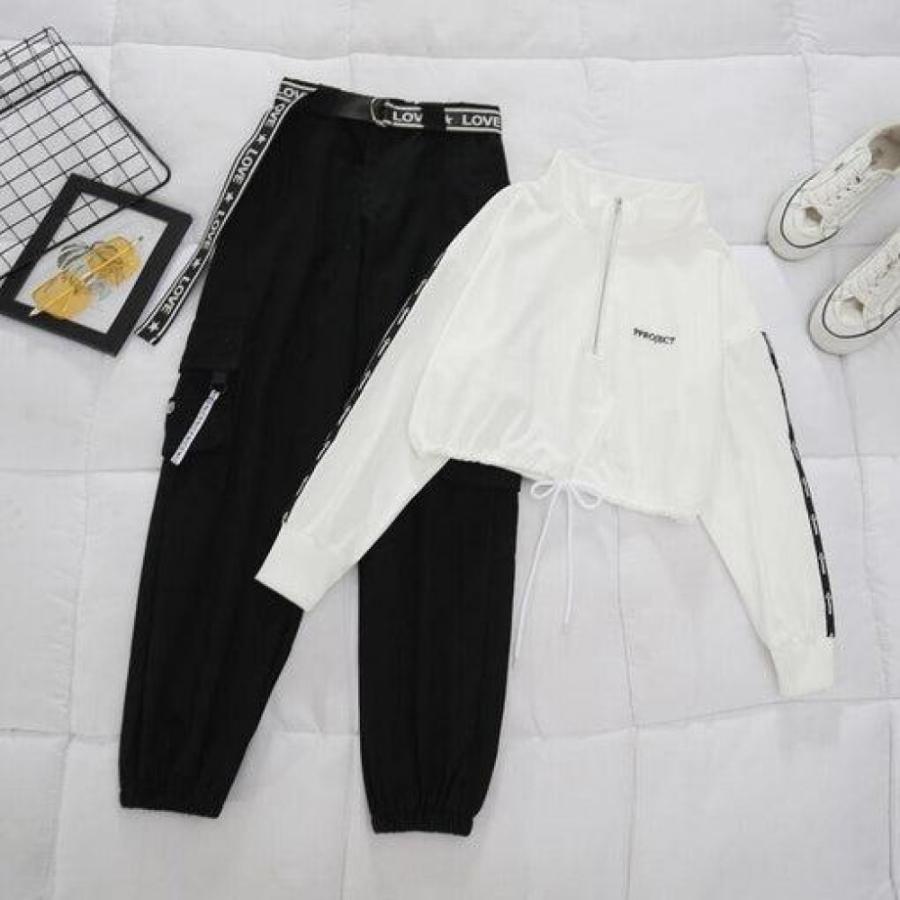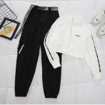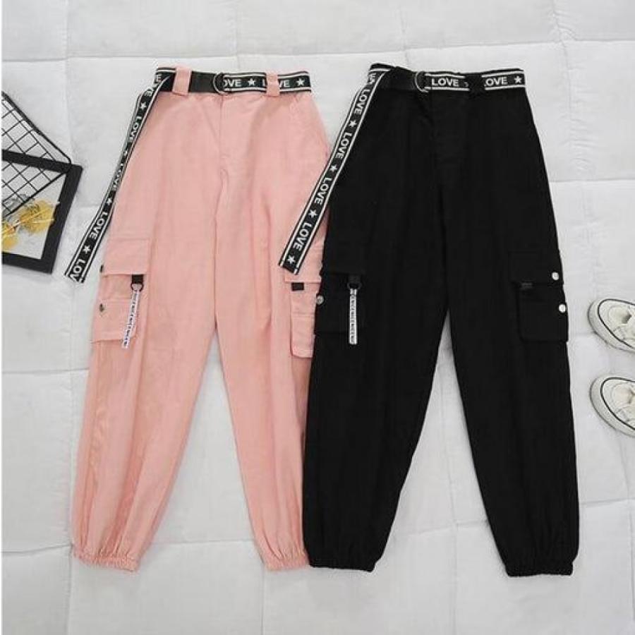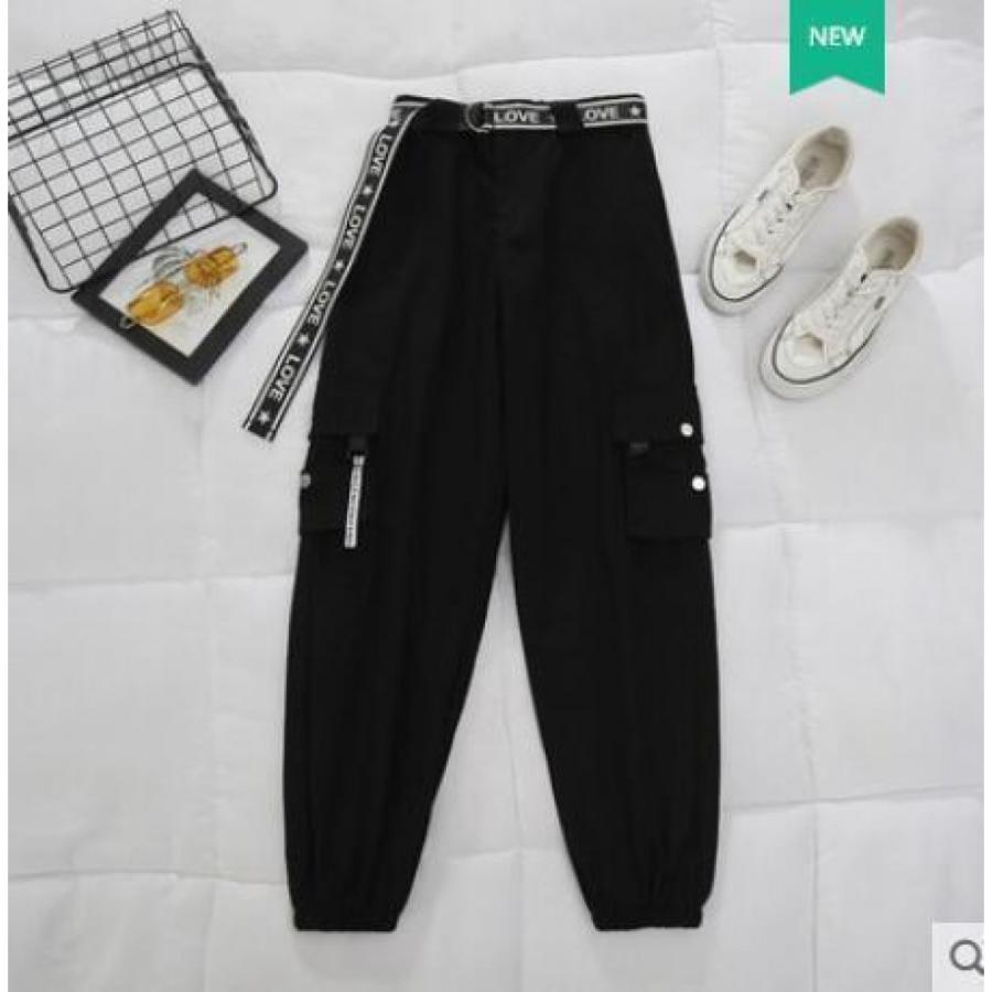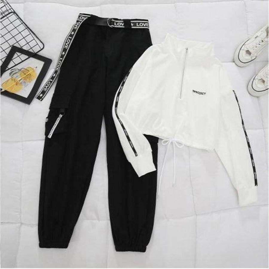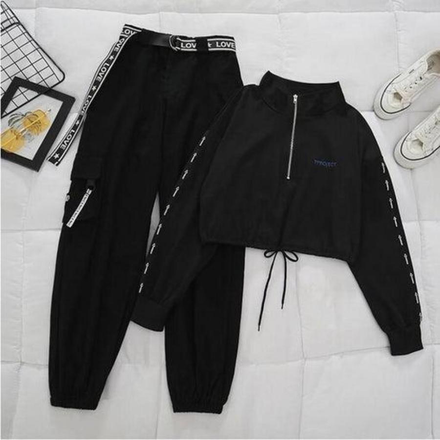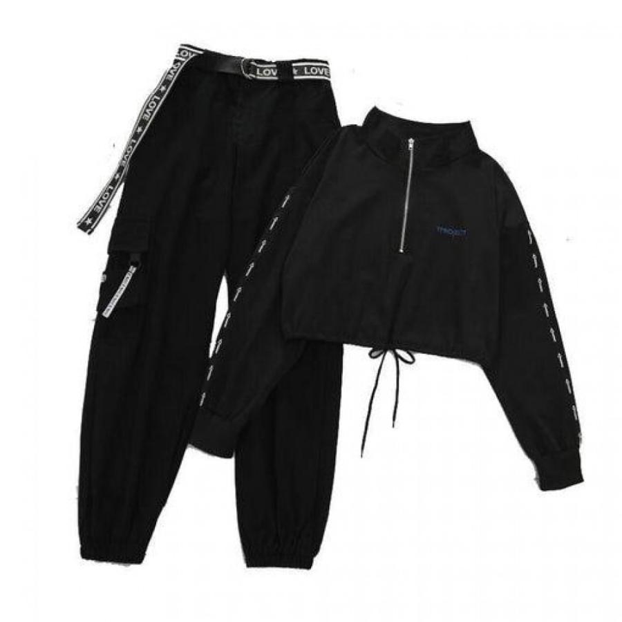 belt zipper female cargo pants hip-hop casual two-piece streetwear black 2 piece set harajuku loose bf harem pants