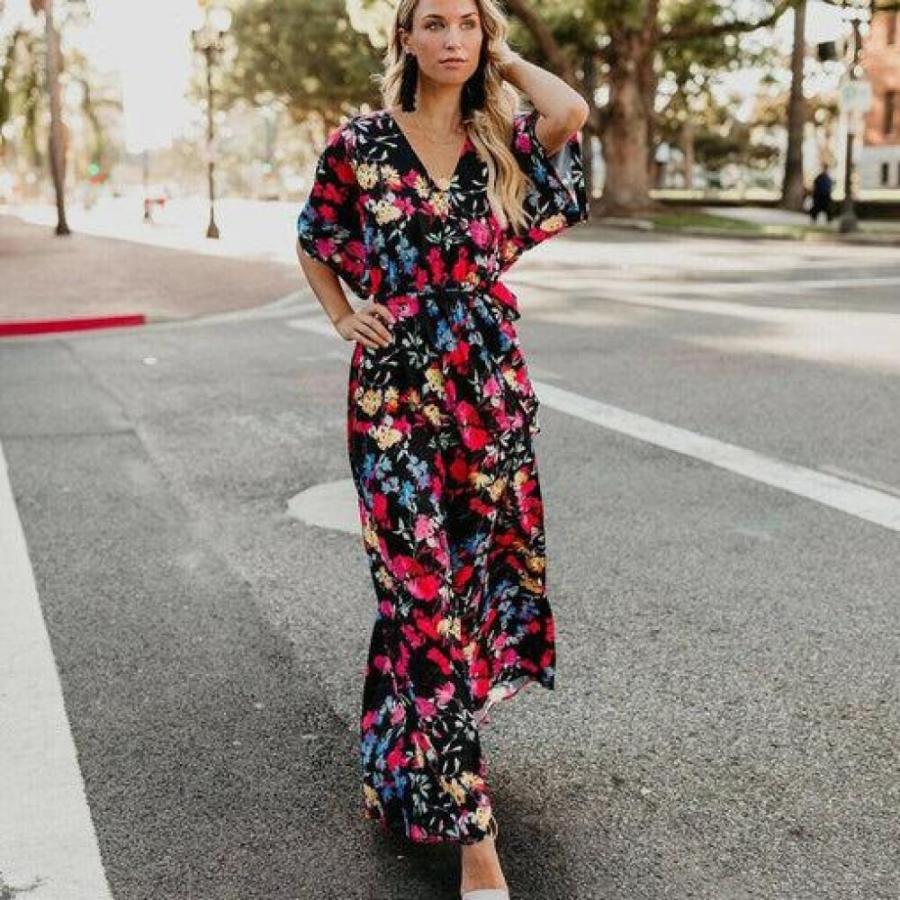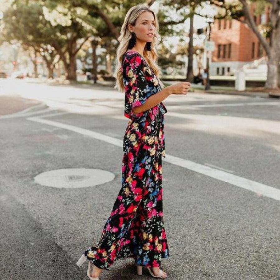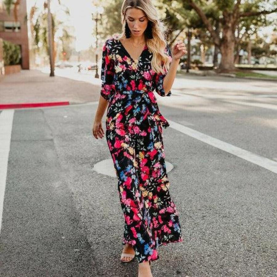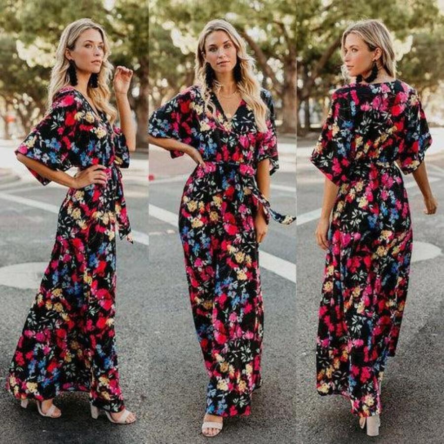 boho floral printed long maxi dress elegant women short sleeve v-neck loose dress ladies summer party beach sundress