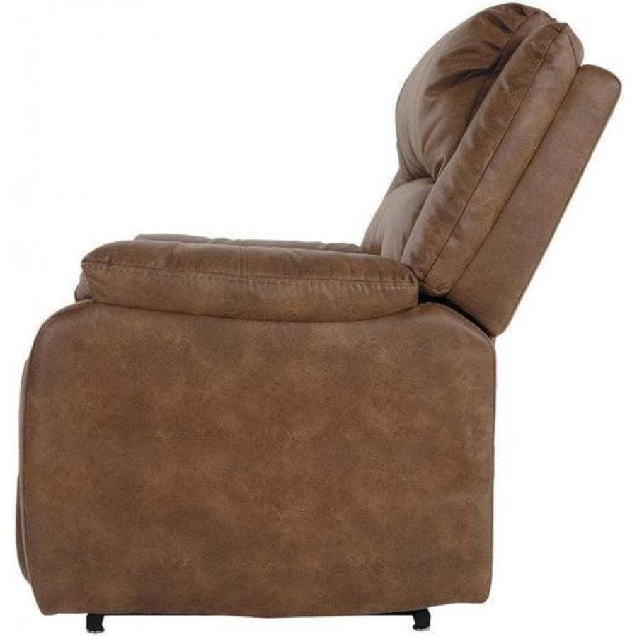 - SMOOTH BROWN UPHOLSTERY: Saddle brown upholstery looks like leather, but is actually thick poly fiber with a cozy feel-good touch. ed for comfort with a high back, thick cushions and sturdy corner-blocked framed with metal reinforced seat