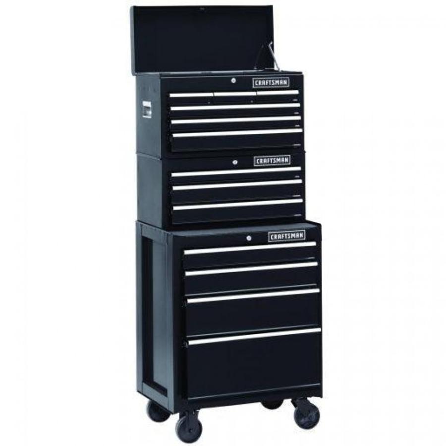 With the Craftsman 26′′ black 3-drawer heavy-duty middle chest, you can store up to 75 lbs. of tools in each drawer. Save space in your garage and have the tools you need at the ready with this sleek chest. DynaGlide ensures you can slide each drawer with ease. Built tough, this tool chest can withstand the conditions of your garage for years.
