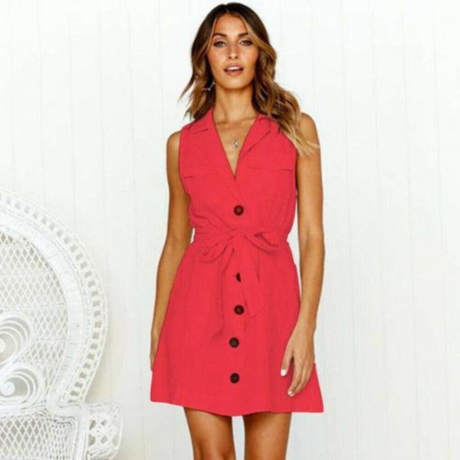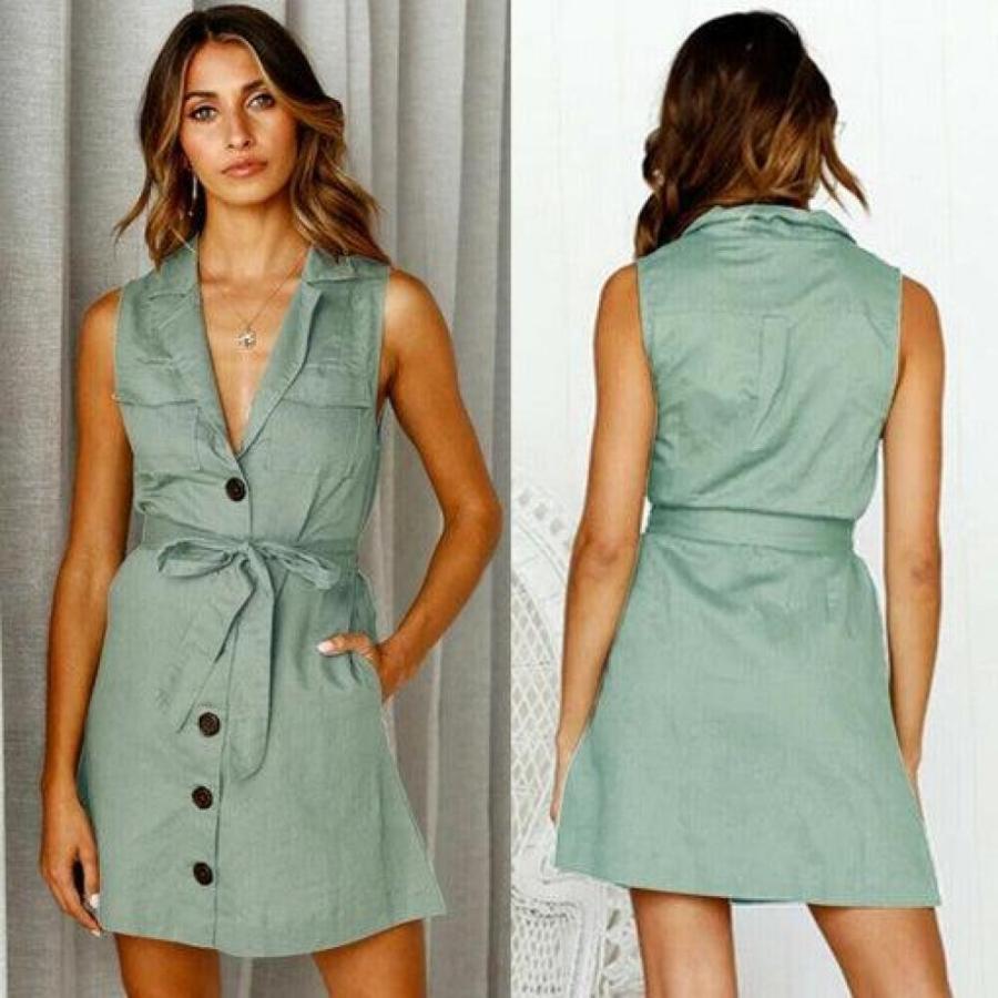 elegant women sleeveless turndown collar button bodycon sundress ol ladies summer holiday beach mini dress