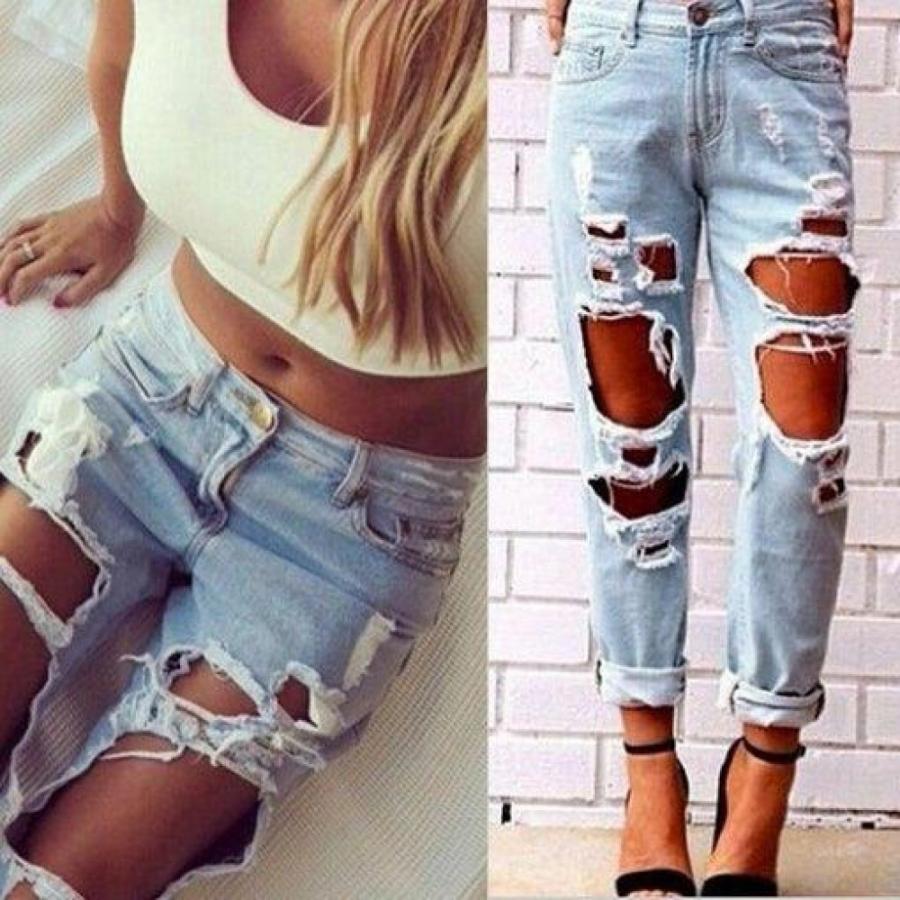fashion women destroyed ripped jeans distressed slim pants high waist denim jeans