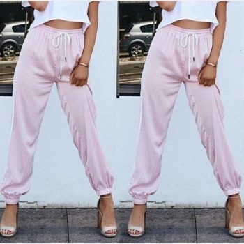fashion women pants side striped loose drawstring elastic high waist slim pencil ladies casual long trouser