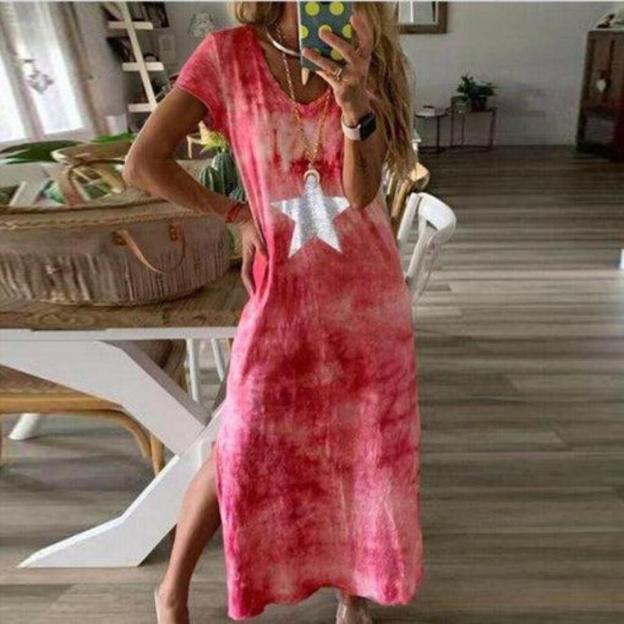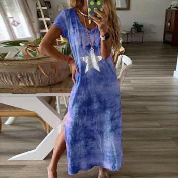 fashion women tie-dye long maxi loose dress ladies short sleeve v neck summer holiday party beach sundress