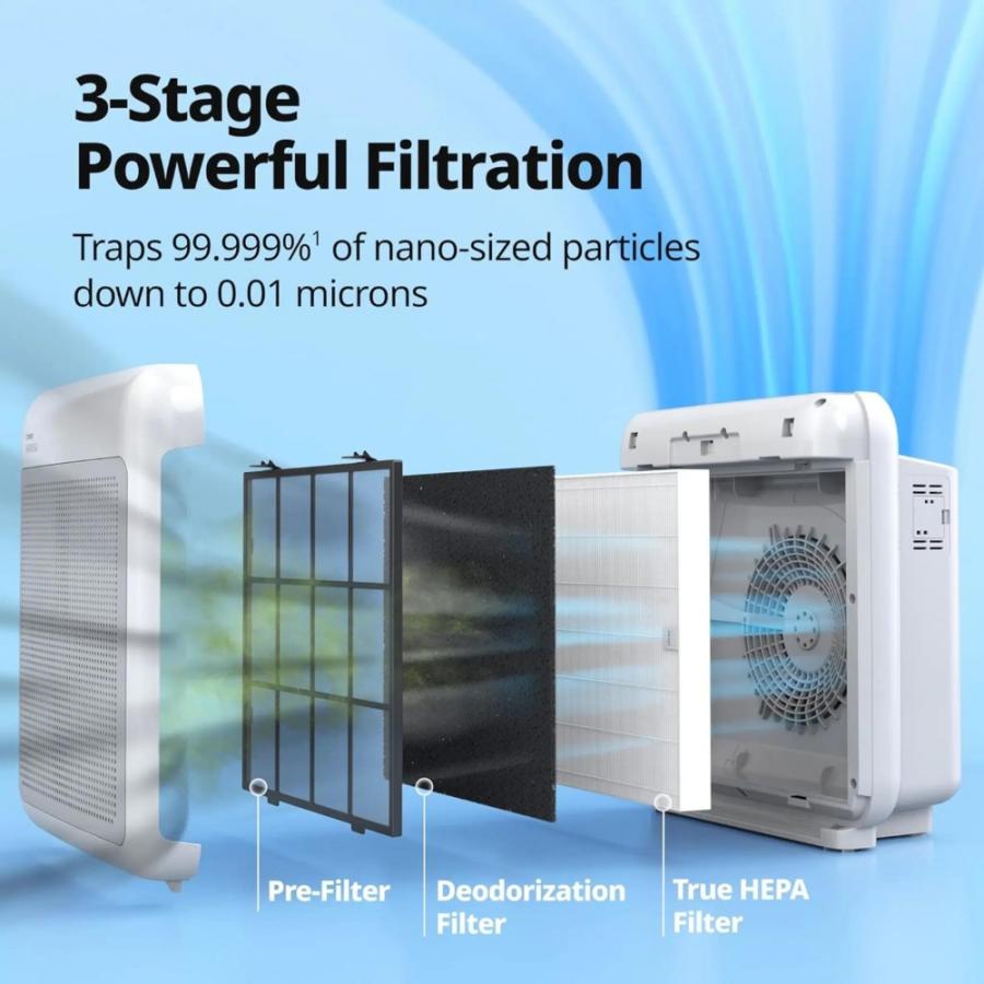 - [HyperCaptive Filtration System] Combination of a pre-filter, deodorization filter, and True HEPA Filter reduces 99.999% of 0.01-micron particles, including pollen and other allergens. It also reduces 99% of volatile organic compounds and odor.