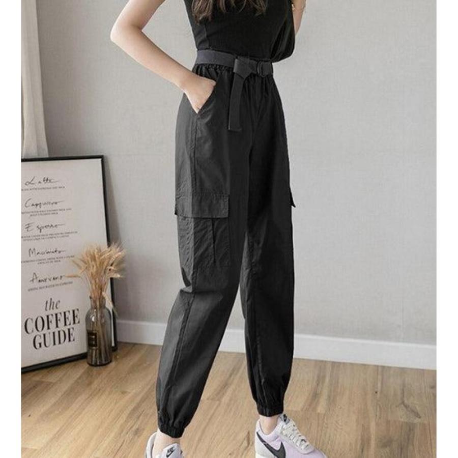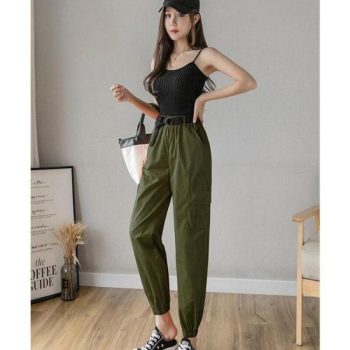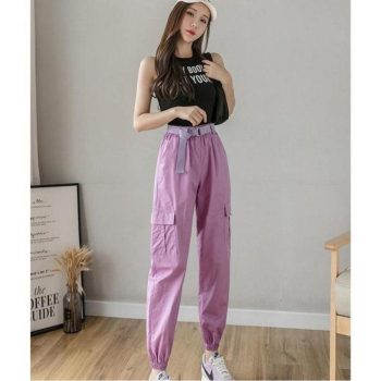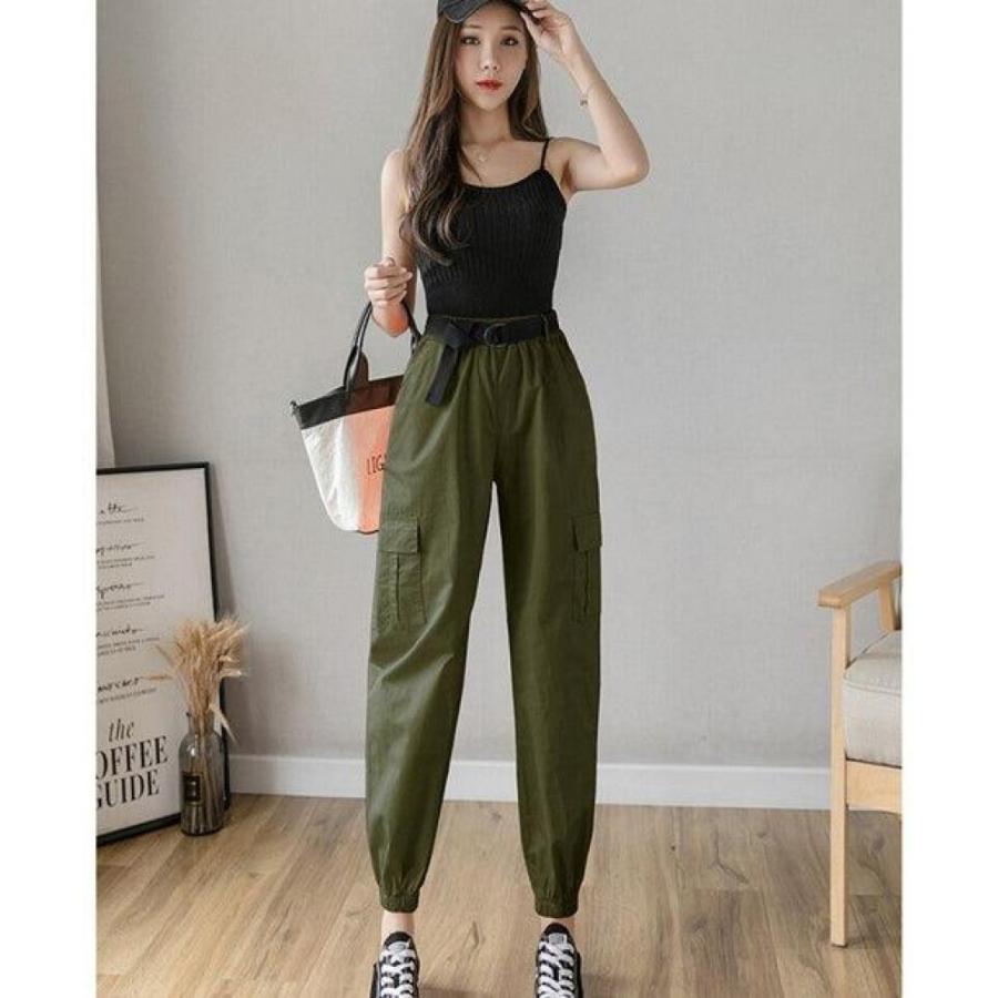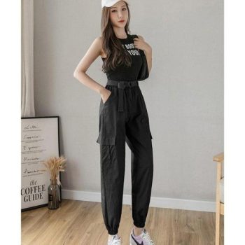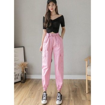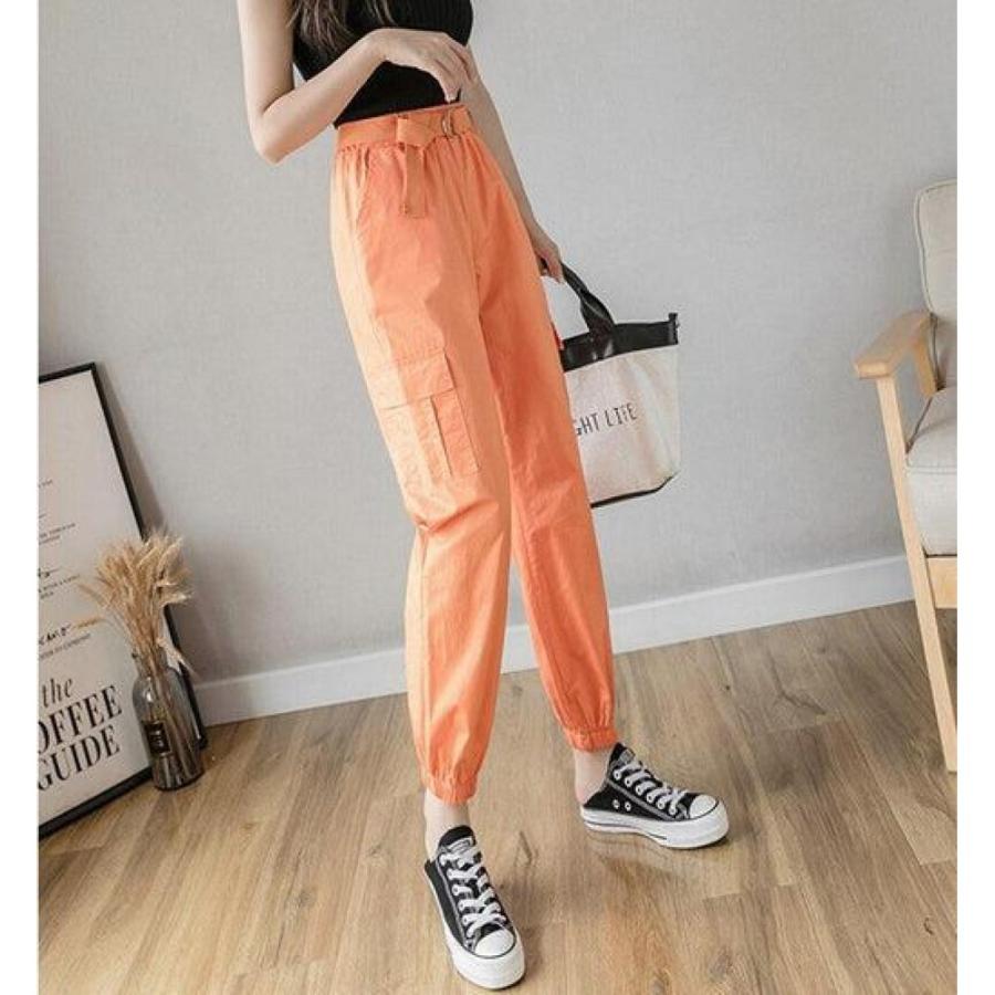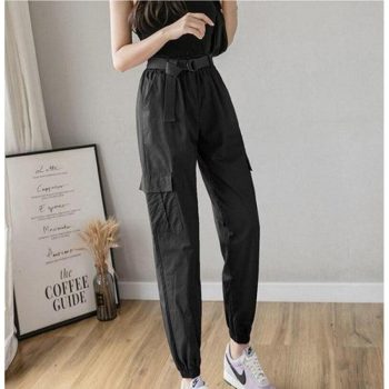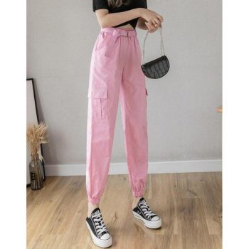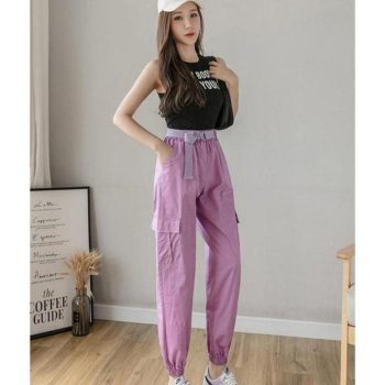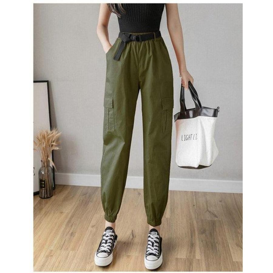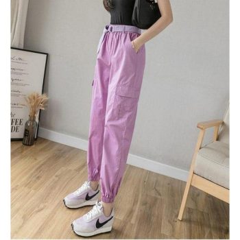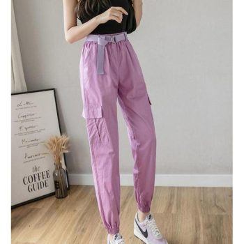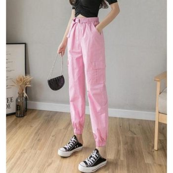 high waistwomen's looses cargo pants with belt nine-point harem pants colorfurhigh waist pants sashes pockets office pants