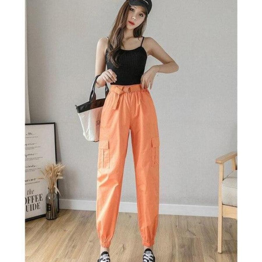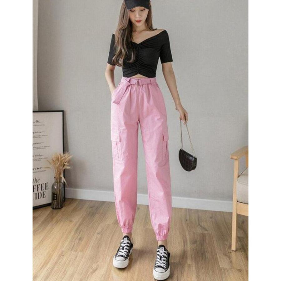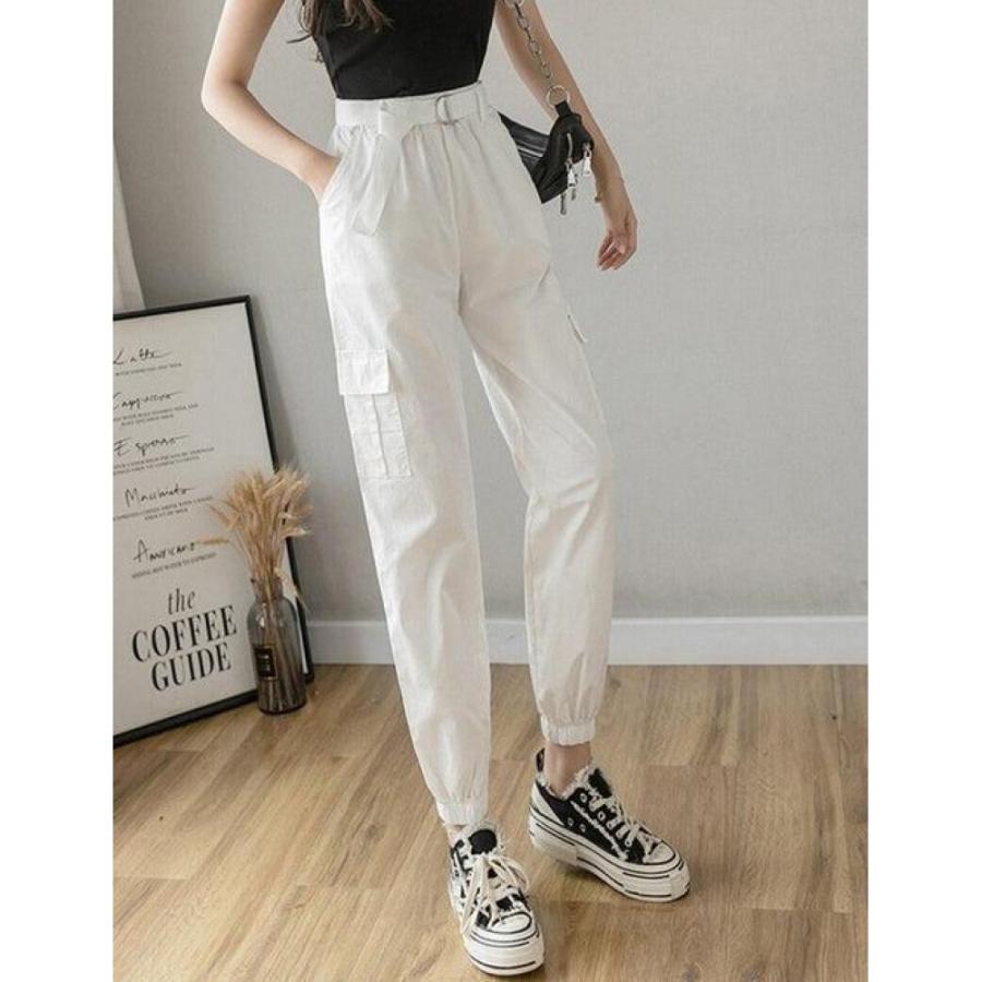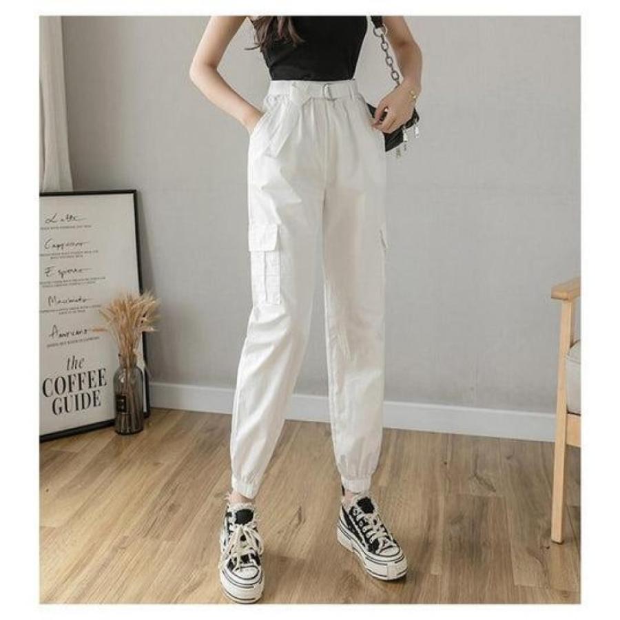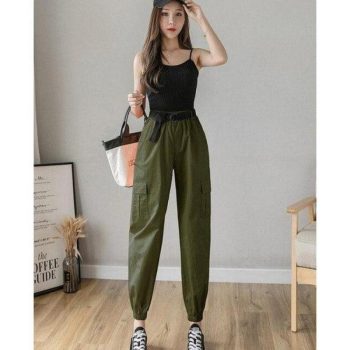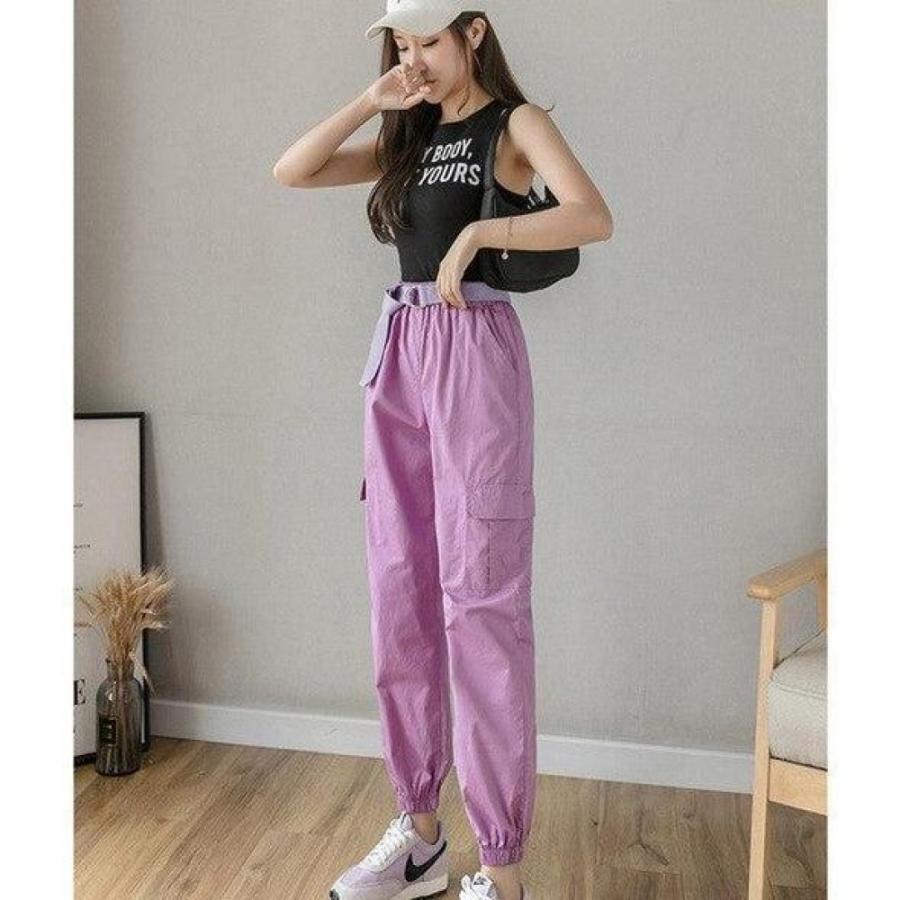 high waistwomen's looses cargo pants with belt nine-point harem pants colorfurhigh waist pants sashes pockets office pants