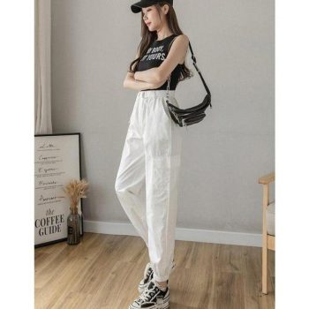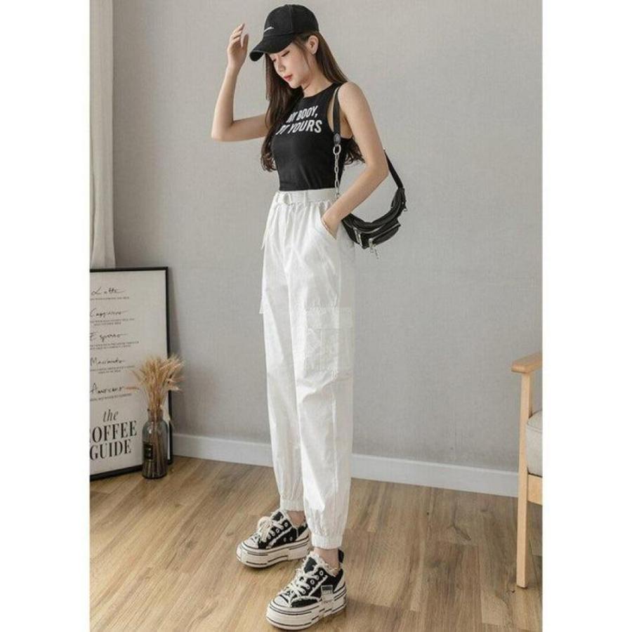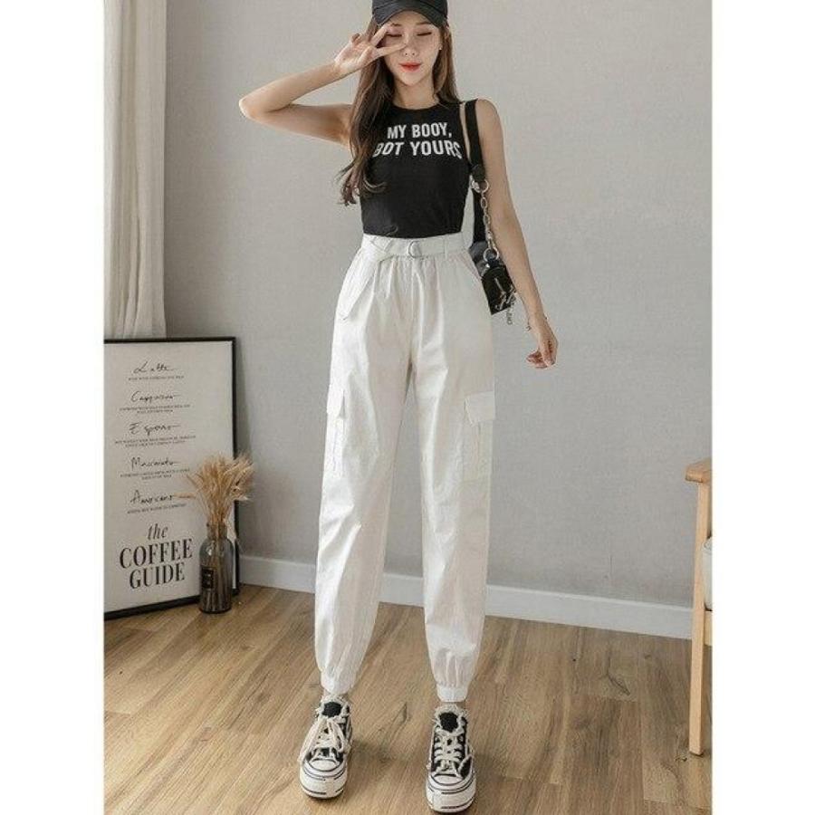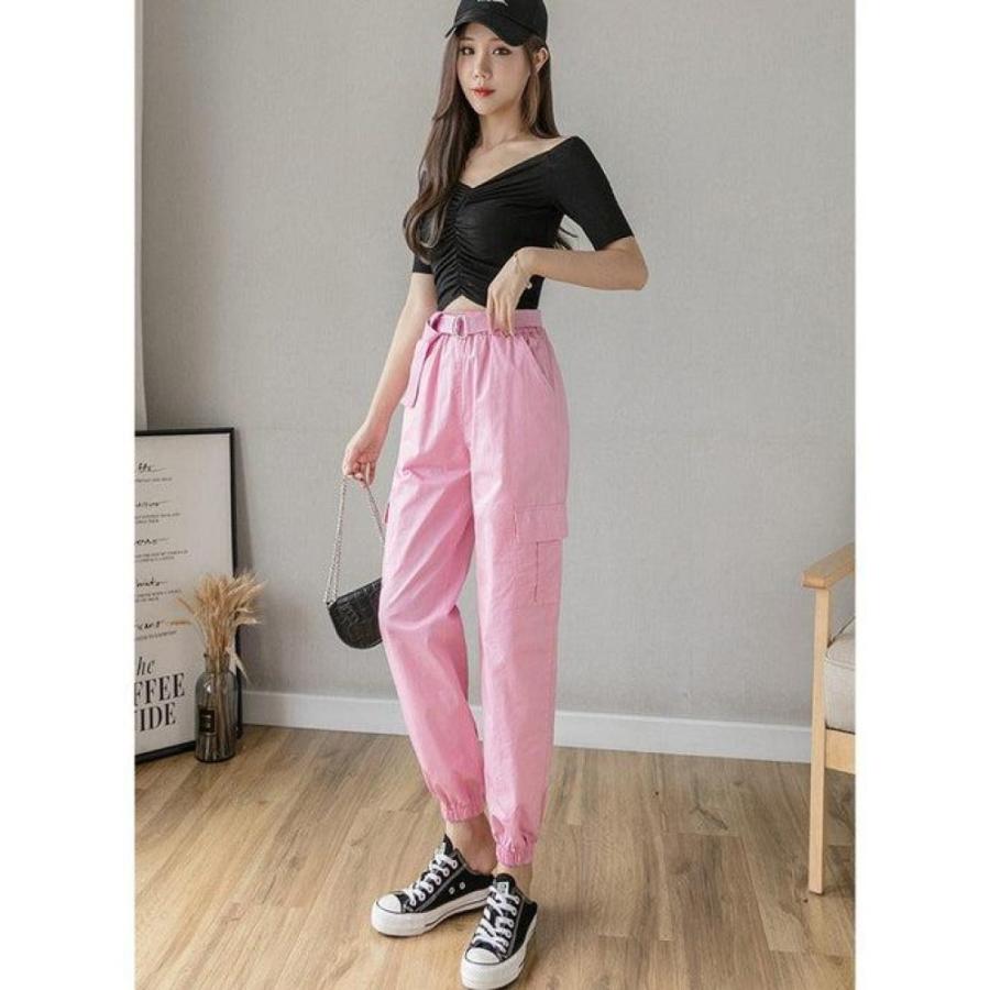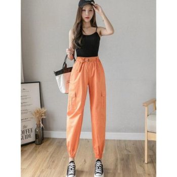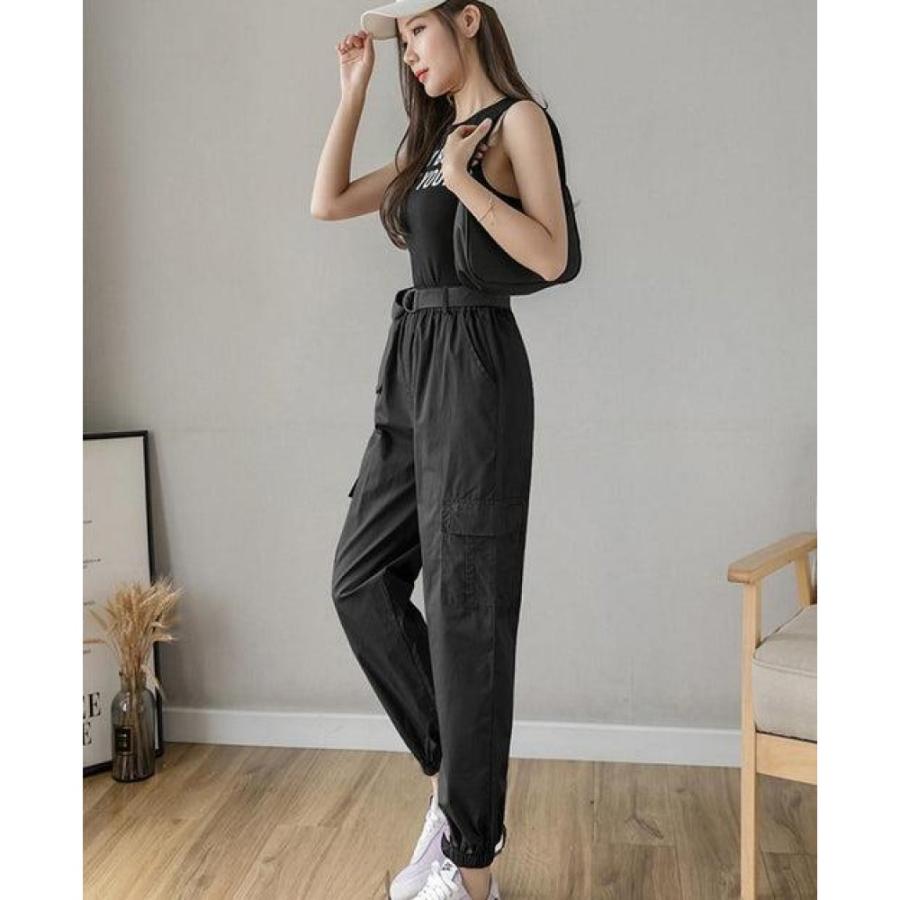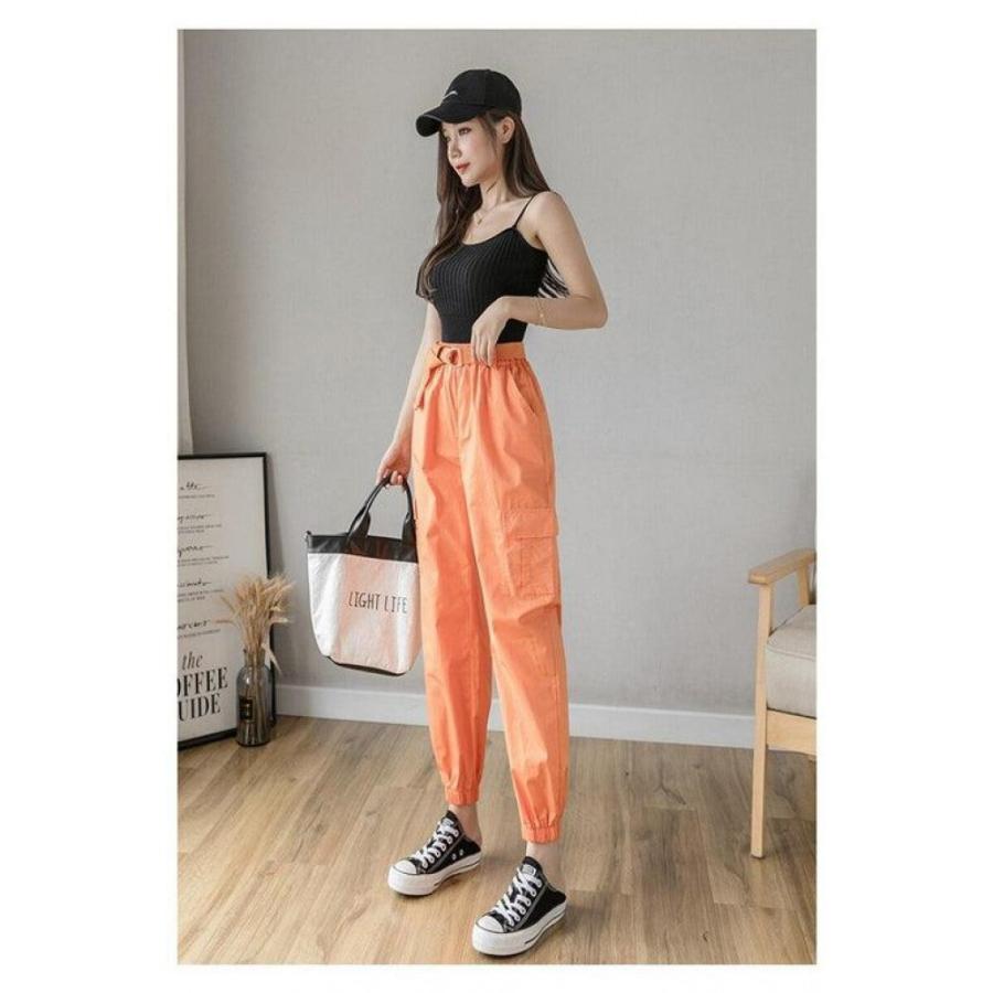 high waistwomen's looses cargo pants with belt nine-point harem pants colorfurhigh waist pants sashes pockets office pants