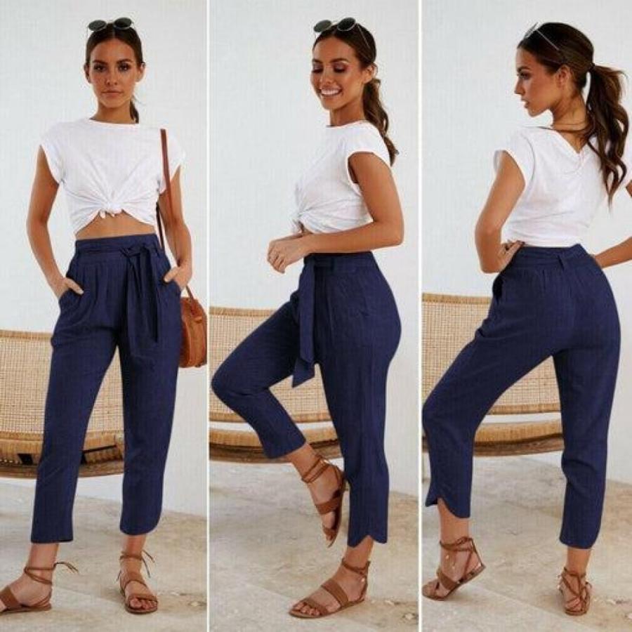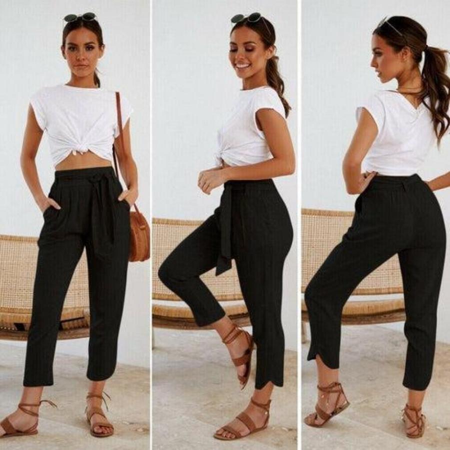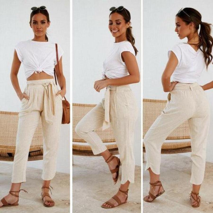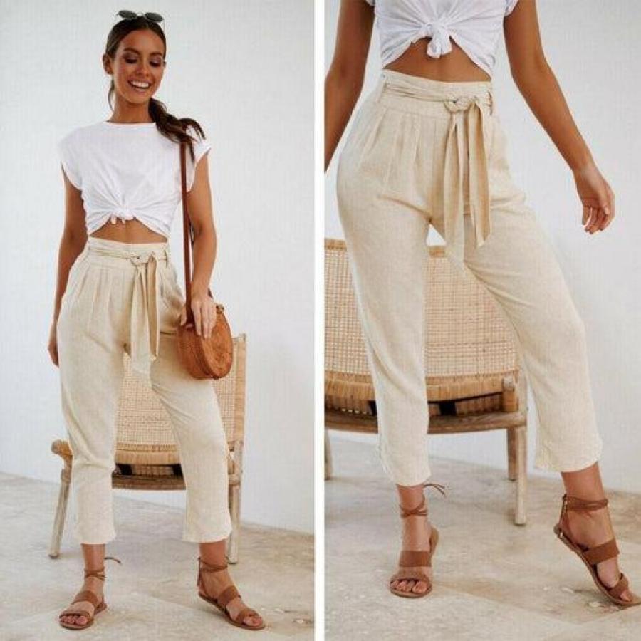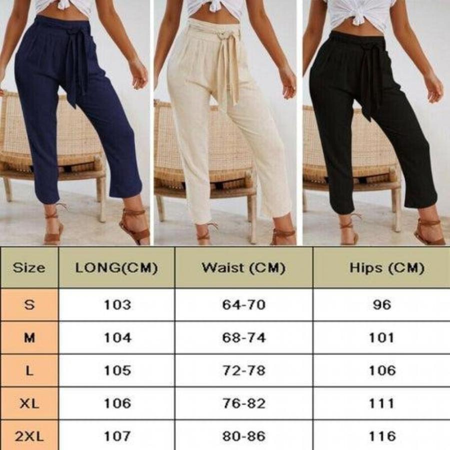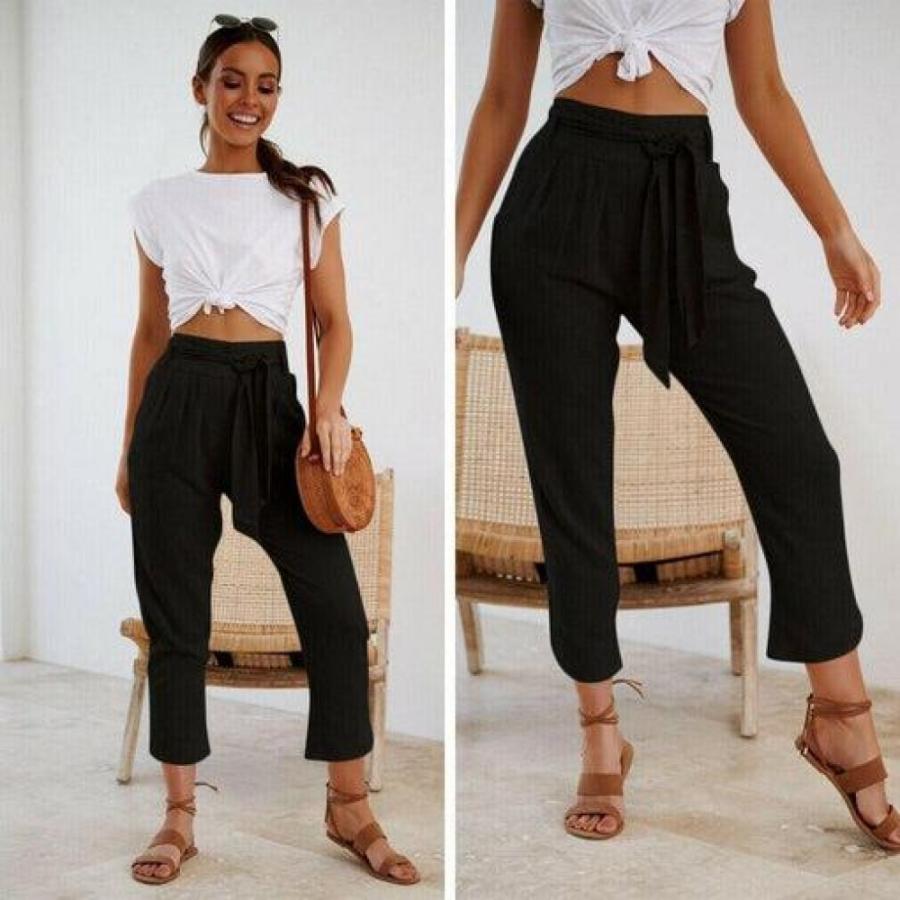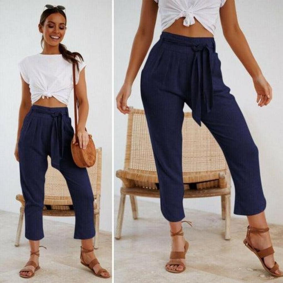 ladies women plain trouser casual summer holiday pants 2019 new fashion women tie up high waist slim bottoms