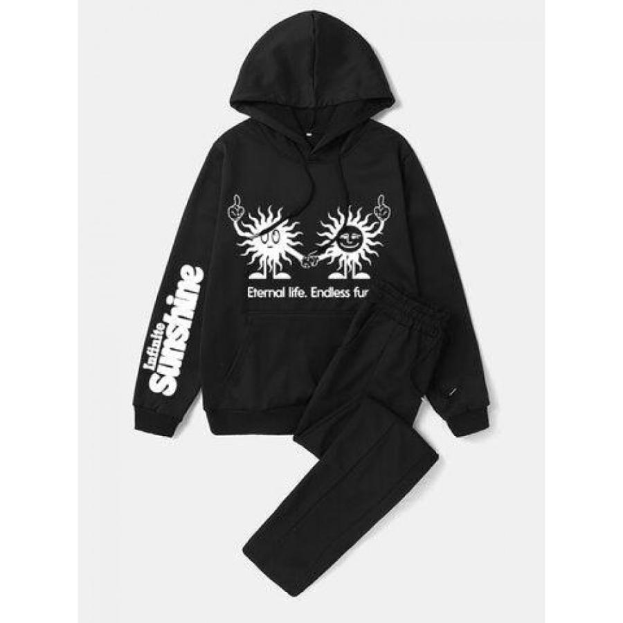 Mens Cartoon Sun Letter Print Hoodie Two Pieces Outfits With Seam Pants