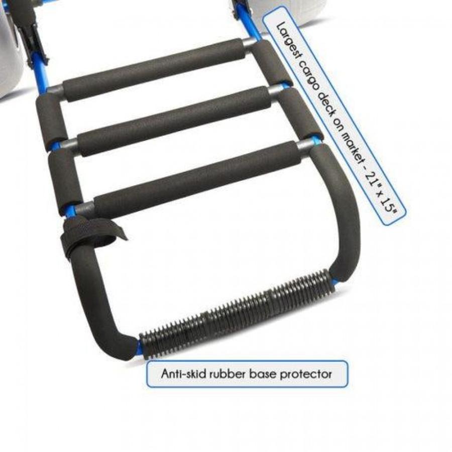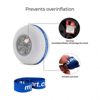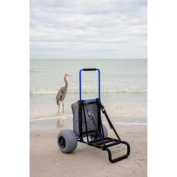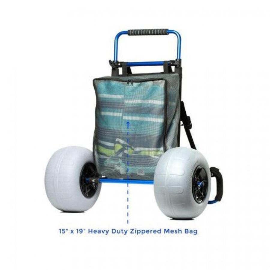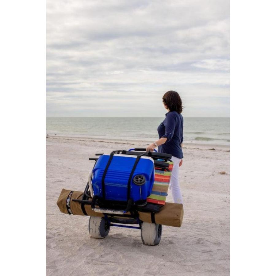 The original My Beach Cart holds all your beach gear with 12′′ balloon tires that glide over sand with ease! Made with marine grade aluminum frame and stainless steel hardware, it will NOT RUST. It has the largest cargo deck on the market at 21′′ x 15′′ and a sturdy rubber base protector. It is heavy duty and able to carry all your gear in one trip. Anti-slip foam keeps your cargo from sliding while in motion. Mesh bag included to hold extra items. Tires are easily removed with spring loaded pins. Free handy My Beach Cart tire inflation tool is included with purchase – prevents over-inflation of the balloon tires. Two sturdy 10′ cam buckle straps hold all your gear in place.