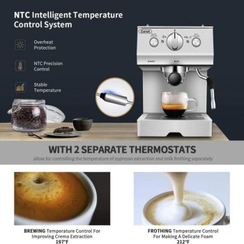 Gevi Silver Espresso Coffee Machine with 50 oz removable water tank has 15-bar pressure pump which ensures the coffee flavors, maintaining the aroma of the coffee.