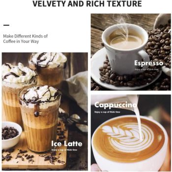 PROFESSIONAL FROTHING WAND: Frothing milk for cappuccino and latte by hot steam wand. The steam wand rotate 360 degrees, which can produce silky and smooth milk foam better.