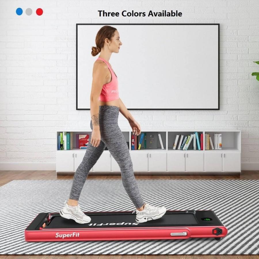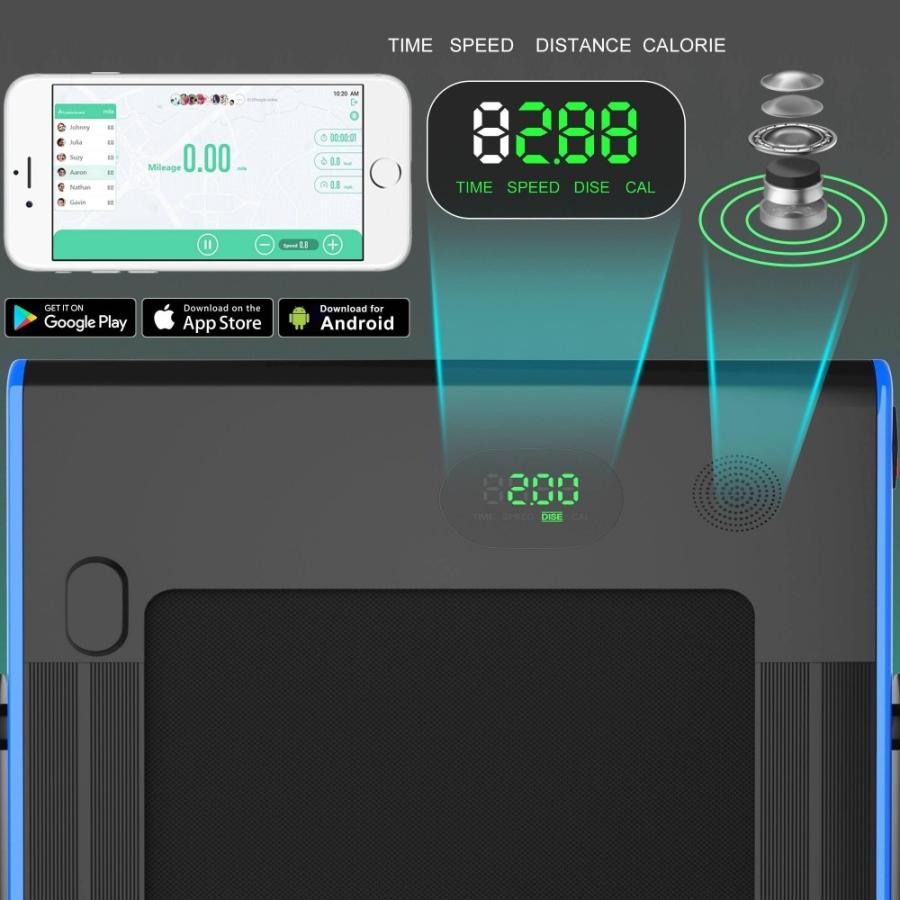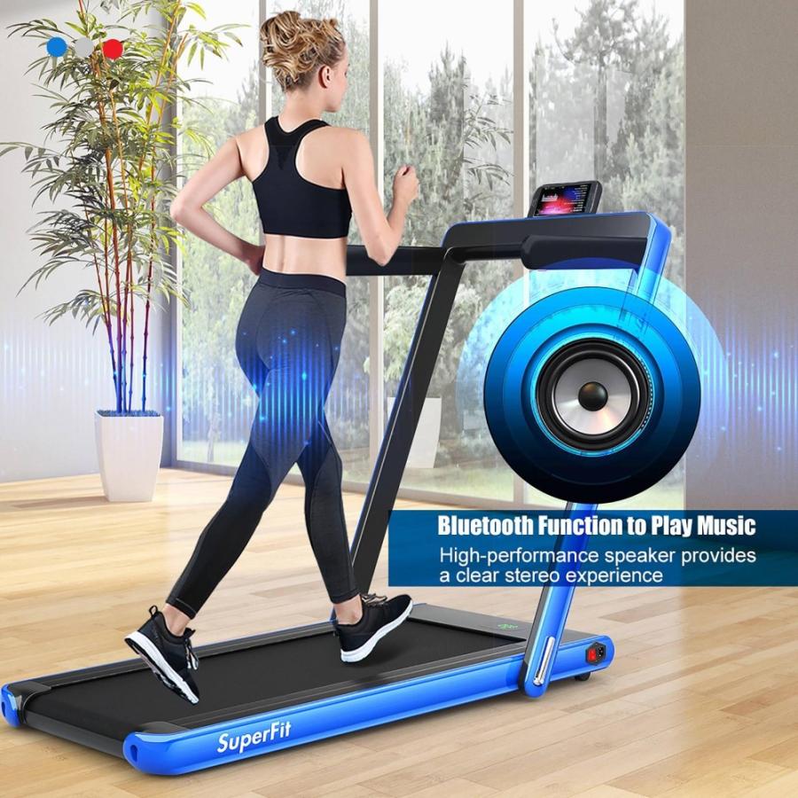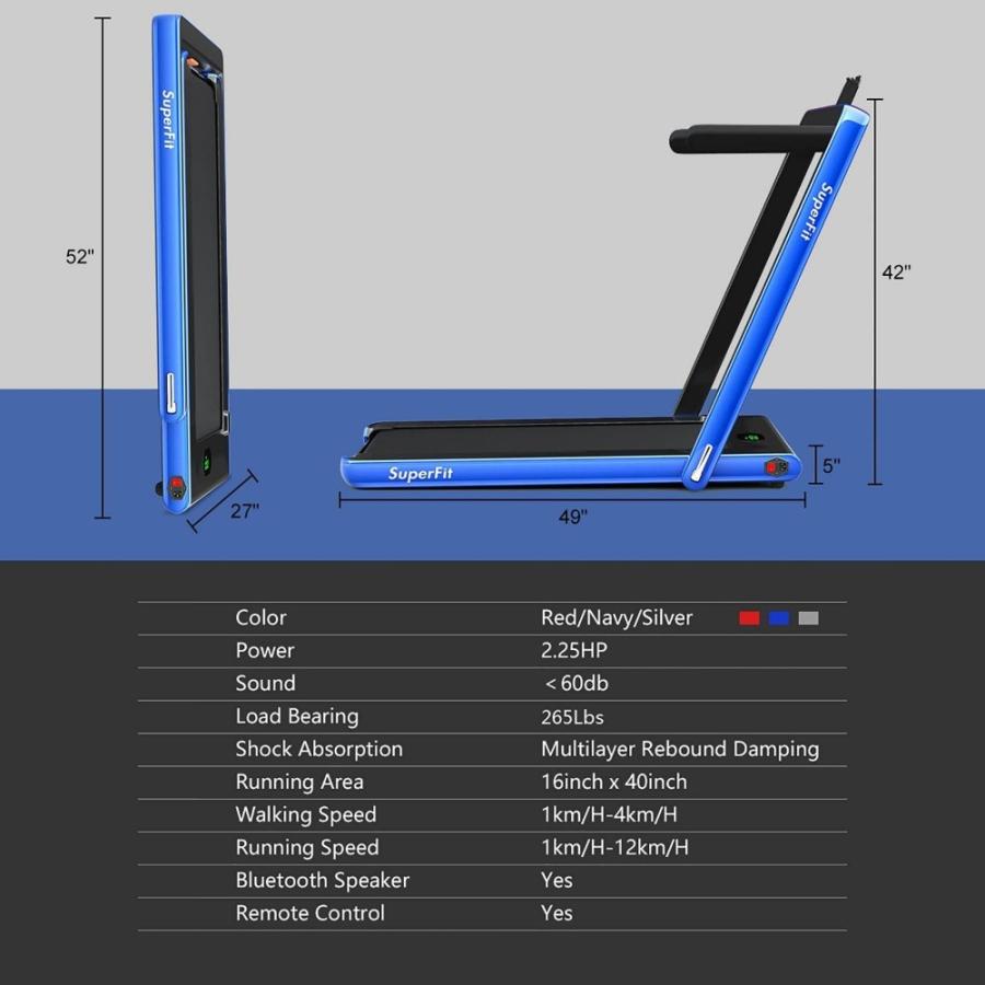 Do you want to have a healthy body and a perfect figure? Our innovative 2-in-1 folding treadmill has 2 sport modes that can be used as a running treadmill and a under desk walking treadmill. You can use it for walking, jogging and running, which is very suitable for home, office and gym. With a powerful 2.25 HP ultra-quiet motor, it provides you with a quiet and comfortable sports environment without disturbing others. 7-layer non-slip and shock-absorbing running belt provides effective cushioning for your back, joints, muscles, knees and ankles. A versatile LED display monitors your movement data in real time. You can connect the treadmill to your phone through Bluetooth and play music while you are exercising. Equipped with a remote control and a safety key for immediate stop in an emergency. The compact design and transport wheels make this treadmill easy to fold, move and store. Start exercising now and burn your calories! Feature 2-in-1 treadmill can be used as a under desk treadmill and a running treadmill Speed of running belt is 1-4km/h in the walking mode Powerful 2.25 hp quiet motor makes your running quieter Phone holder can watch videos or chat with friends while running 7-layer non-slip running belt provides an effective cushion for your knees LED display clearly shows time, speed, distance and calories Smart APP control is perfect to record exercise data and running with other users Safety key ensures that the treadmill is stopped immediately in an emergency Specification Material: ABS Color: SilverBlueRedBlack Overall Dimension: 49”x 27”x 42” Folding Dimension: 52”x 27”x 5” Running Area Size: 40” x16” Net Weight: 74 lbs Weigh Capacity: 265 lbs Working Voltage: AC 110V 60Hz Peak Motor Power: 2.25HP Speed: 1.0-12.0 km/h Control Method: Controller Screen Display: Time, Speed, Distance, Calorie