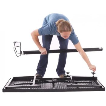 - Three heavy-duty aluminum cross bars support the wire mesh floor