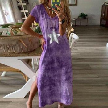Fashion Women Tie-Dye Long Maxi Loose Dress Ladies Short Sleeve V Neck Summer Holiday Party Beach Sundress