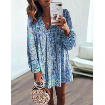 Fashion Women Vintage Boho Loose Dress Bohemian Ladies Summer Long Sleeve Baggy Sundress Beach Holiday Wear