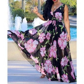 Boho Floral Long Maxi Dress Ladies Casual V Neck Sleeveless Party Holiday Beach Sundress