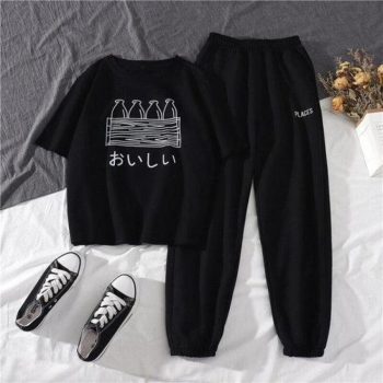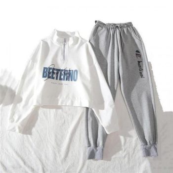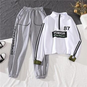 2021 Women Casual Joggers High Waist Loose Female Letter Printed Trousers Ribbon 2 Piece Cargo Pants Women With Sweatshirt