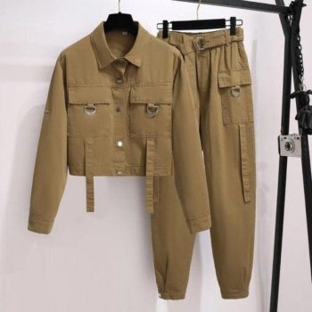 2021 Spring Autumn New High Waist Cargo Pants Loose Bf Sports Harajuku 2 Piece Set Joggers Women With Coat