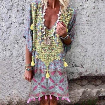 New Women Boho Short Sleeve Dress Summer Printed Beach Ladies Casual Loose Mini Shirt Beach Dress Sundress